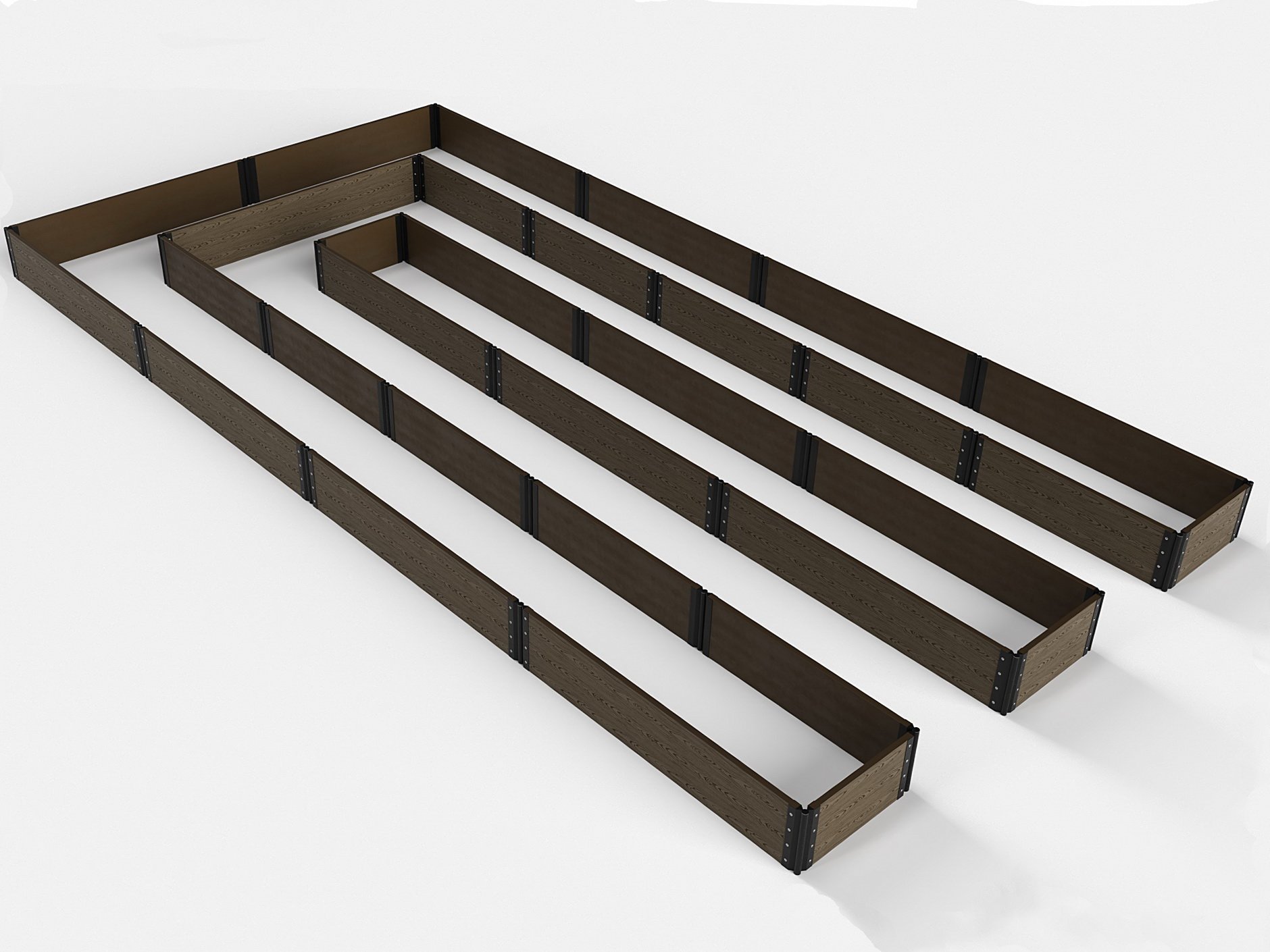 Именно такими являются высокие клумбы и цветники из ДПК с поворотными фрагментами для возможности создания разнообразных фигур. Например, представленные в фотографиях изделия позволяют создать одноярусные клумбы треугольной, прямоугольной формы и в виде звезды, буквы «П» и других символов.